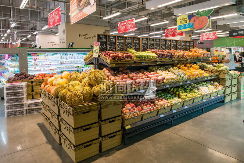 果蔬生鮮一直是超市的重點銷售區(qū)域,“樂購express”果蔬區(qū)采用了專用的果蔬中島貨架,采用斜角度層板,層板式放置不同高度的木框,每個木框可陳列不同的果蔬產(chǎn)品,并在中島架旁邊放置大型果蔬陳列架,整體陳列效果令人滿意!