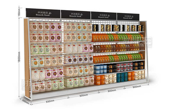 上圖所示是應用于便利店食品區域的單面食品貨架。便利店單面食品貨架采用了通透性更強的網背板設計,再搭配上簡約時尚的木質側板,整體散發出一種小清新的氣息,營造出新時代便利店精致、高端的店鋪形象。