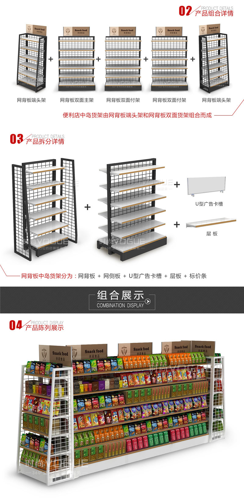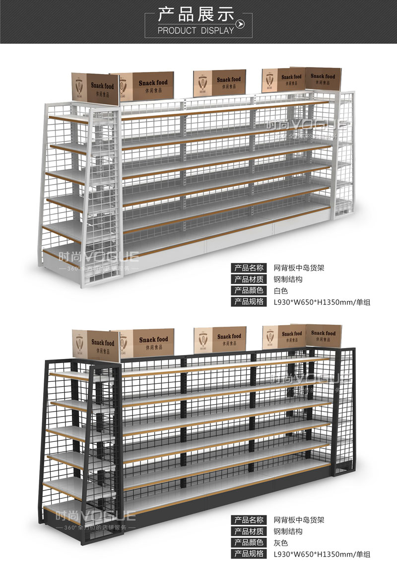 【描述】此款網背板便利店貨架是時尚貨架專為便利店客戶設計的一款高性價比便利店貨架。由于立柱和背板都采用相同材質,所以整個進口食品貨架的顏色非常統一,體現出一種簡約美。