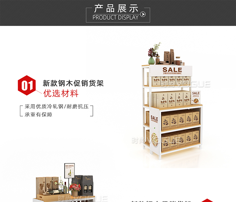 【描述】促銷架采用密度板,經過多道精湛工藝,讓整個貨架具有超強承重力,使用更長久;可多種樣式組合,形成不同的視覺營銷效果,結構更加穩固;可根據需要靈活調整間距,多面陳列,可謂是“商鋪促銷神器”,具有超強儲物、展示能力;亞光的灰色,圓角的層板設計,底部采用剎車輪,小巧便捷,可根據店鋪的營銷需求隨意移動,輕松更改展示區域,也不會造成大量存貨堆積。是便利店促銷商品展示的不二之選。