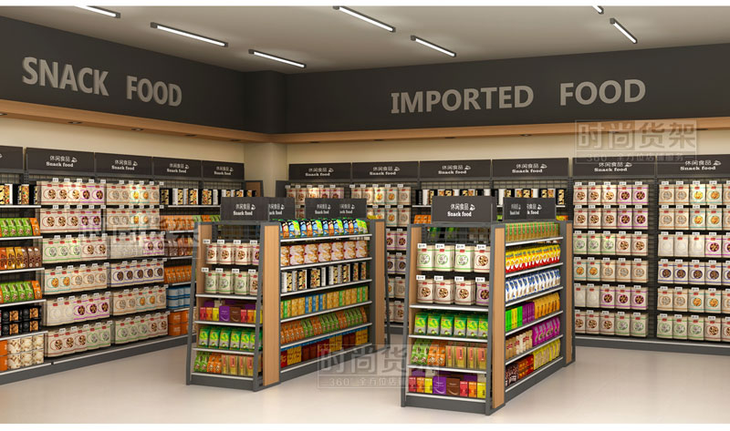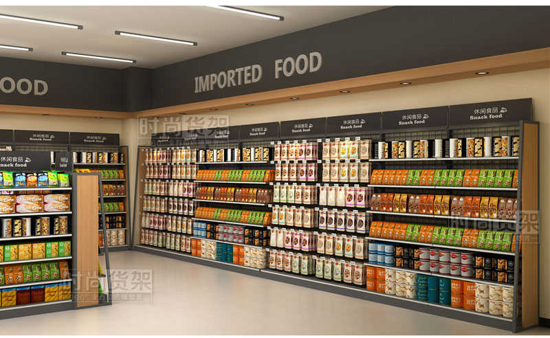 這是時尚貨架專為超市食品區打造的超市單面零食貨架,想了解超市雙面食品貨架請點擊:http://m.yongxinwei.com/supermarket/spzsq/103.html。