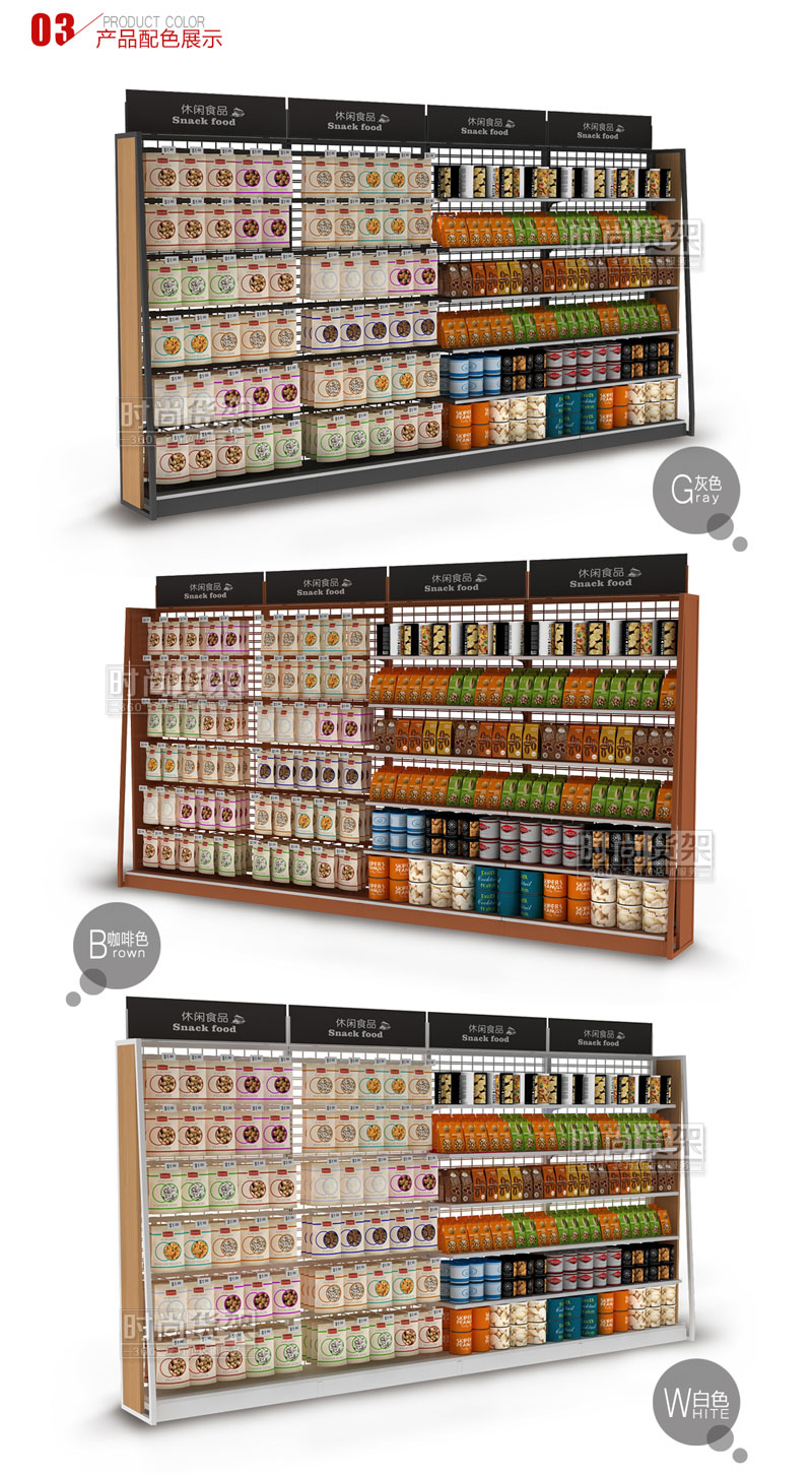 【描述】這款超市貨架適用于超市內的食品區域,用以陳列零食類商品。一組完整的超市單面零食貨架由主架、付架組合而成,這種組合式貨架最大的特點就是尺寸變換較為靈活,只需增減付架數量就能控制貨架整體的長度,適應各個規模的超市使用。